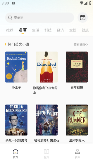 1、下载安装后打开软件进入首页,可浏览推荐内容或搜索感兴趣的英文读物;