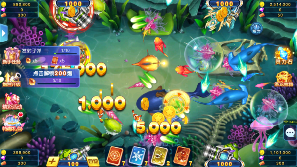 2、开炮会消耗金币,成功捕获鱼群后可获得对应数量的金币奖励。
