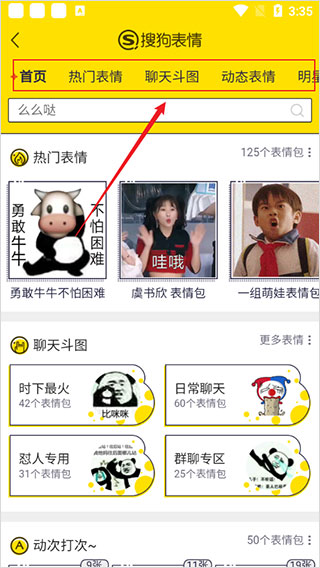 1、打开软件进入主界面,通过分类板块筛选所需的表情包类型,精准查找;