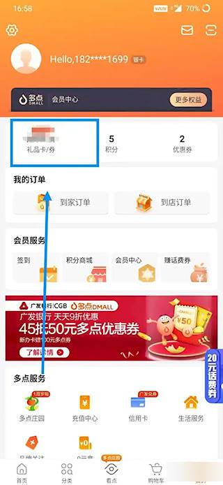 3、进入后查看礼品卡券,点击进入详情。
