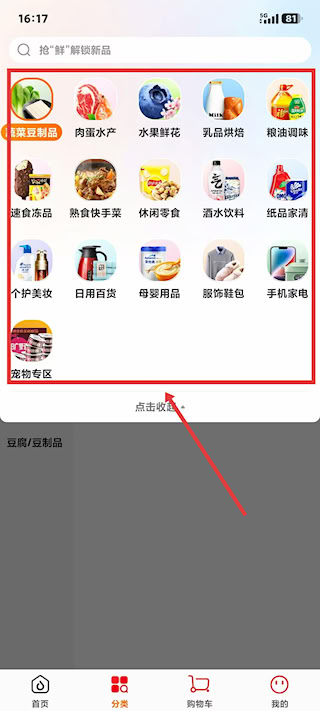 2、分类页面品类丰富,从蔬菜豆制品、肉蛋水产到水果鲜花、乳品烘焙依次排列,还有速食冻品、个护美妆等多元分类,清晰布局助力快速定位所需商品。