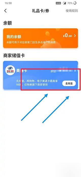 4、在礼品卡券页面找到商家充值卡,点击进入。