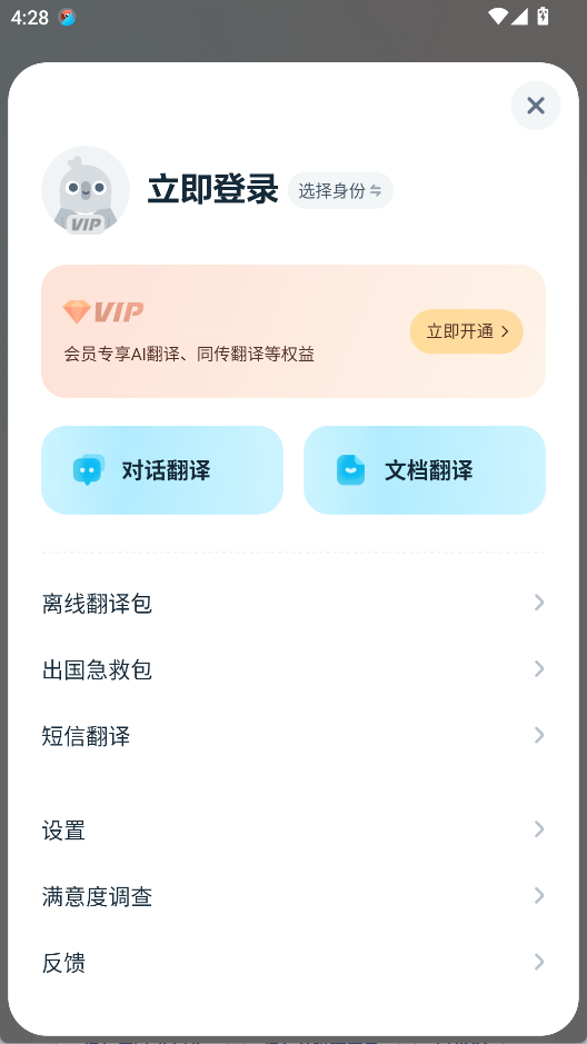 1、翻译界面提供了文本、拍照、文档等翻译方式