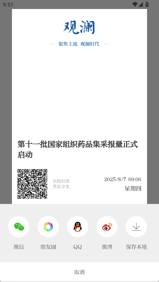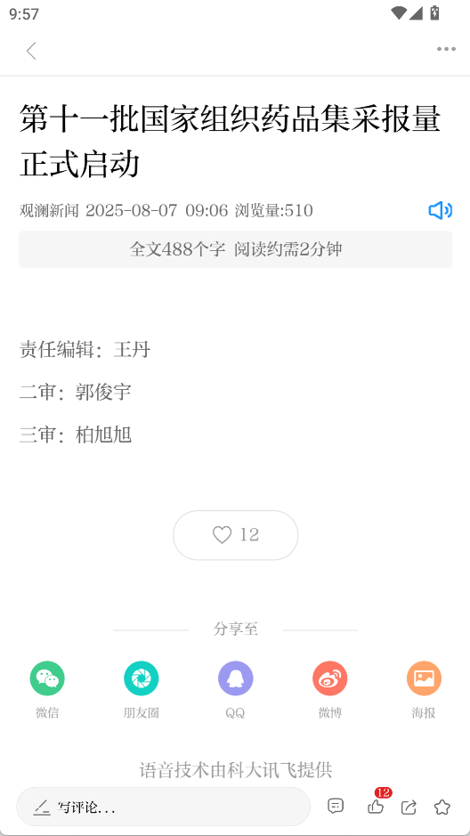 2、在阅读界面的文章内容下面,提供了多种分享方式
