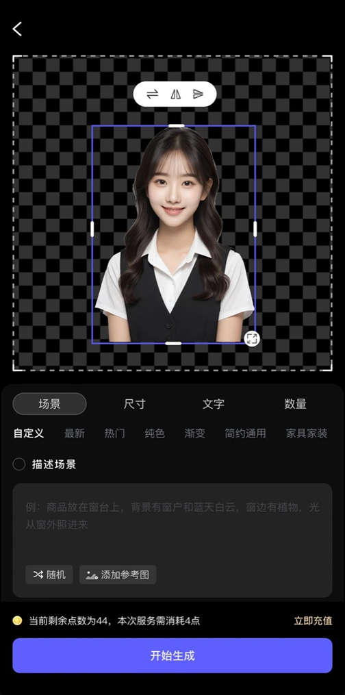 3、抠图完成后,可选择背景生成功能,自主设置图片尺寸与文字内容,完善创作。