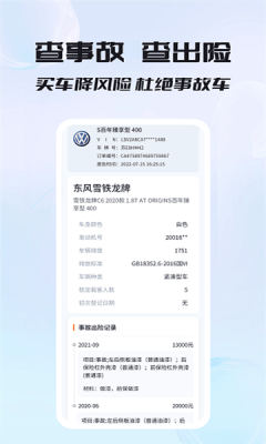 3. 软件还提供车辆出险记录查询功能,帮助用户了解车辆是否发生过事故以及事故的详细情况。