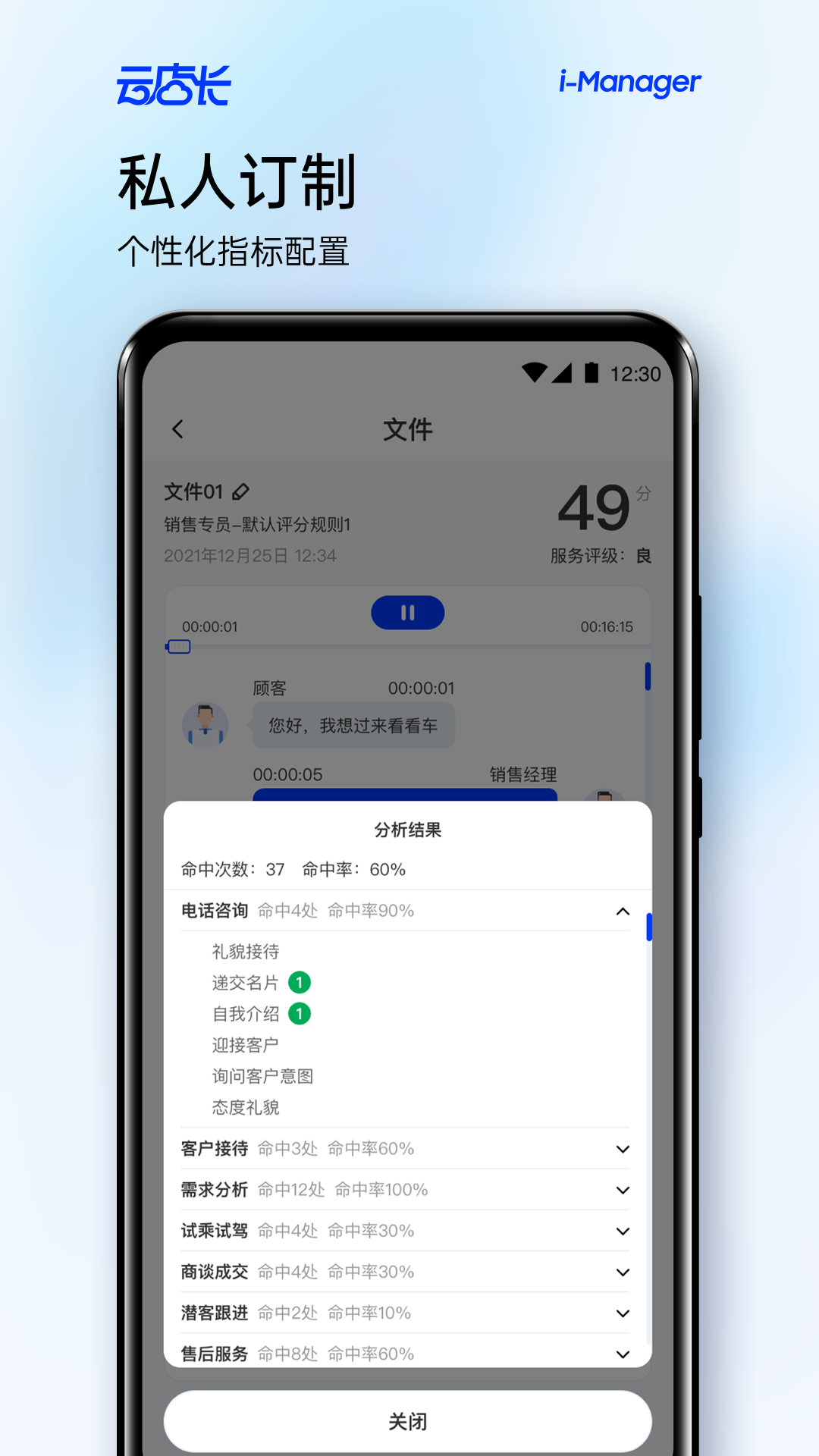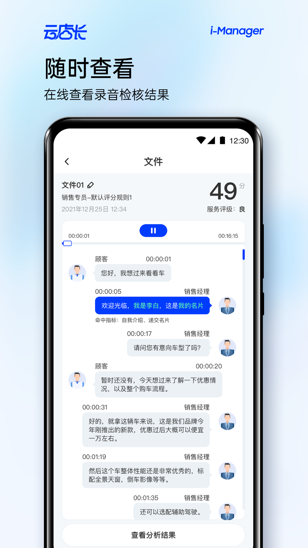一款非常高效实用的办公软件云店长推荐给大家,这款软件功能十分强大,可以随时记录服务流程录音,并且自动将语音转换为文字,帮助大家更好的梳理服务过程中的薄弱点,进行针对性的训练,提升整体的服务水平。