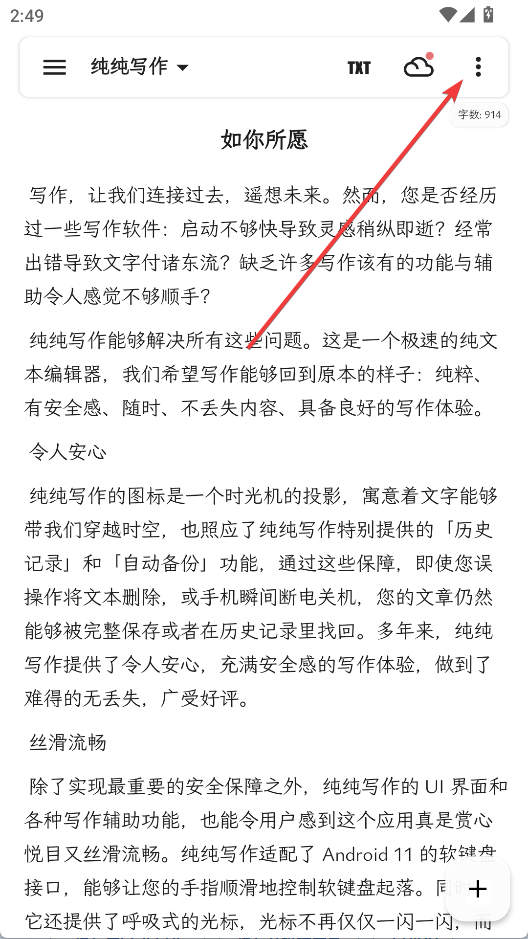 1、打开纯纯写作app,点击右上角的三点按钮
