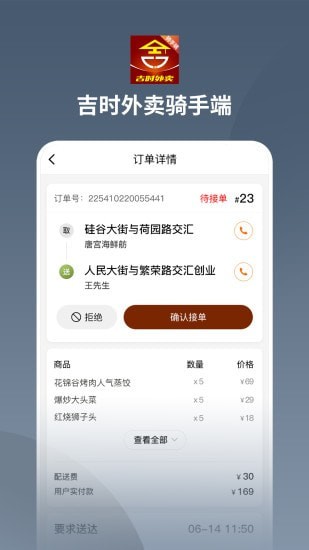 全新打造的吉时外卖骑手端app,是专为外卖骑手们服务的配送辅助软件,帮助用户们提供优质的接单服务。平台上拥有非常多的外卖订单资源,而且还可以帮助小伙伴们在线抢单,所有的订单都是根据距离的远近来排序的,顾客们可以体验优质的外卖服务。
