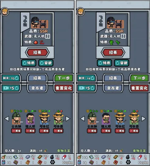 一般来说,高级幸存者都得刷出比较好的特性,至少不是废物属性,比如半感染者士兵/非半感染者特警就是比较能用的特性;高级幸存者相对难出,而刚好又随机到不好的属性那就废了,就像不是半感染者的士兵战斗力直接大打折扣,半感染者特警则是直接变路边。