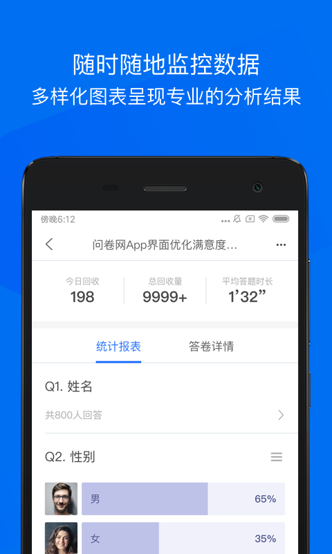 3. 数据查看与分析:用户可以在app中实时查看问卷的填写情况,包括选择比例、平均分等信息,并生成图表进行展示。