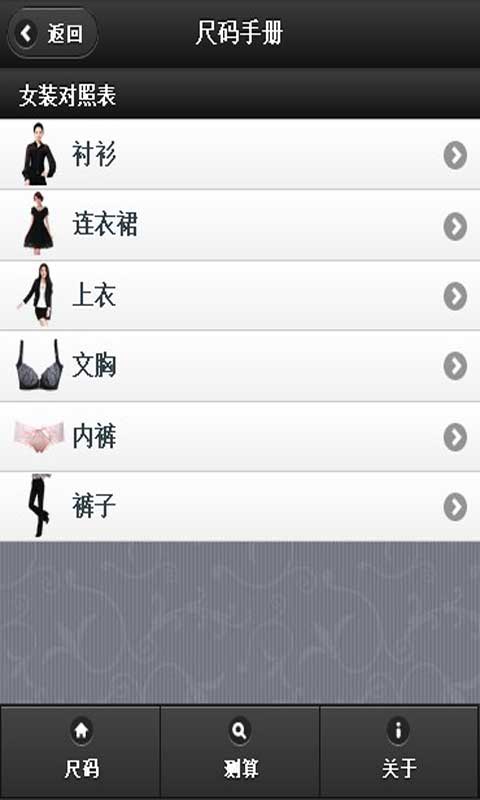 尺码手册提供服装、文胸、鞋码的测算,和通常的尺码对照表参考。