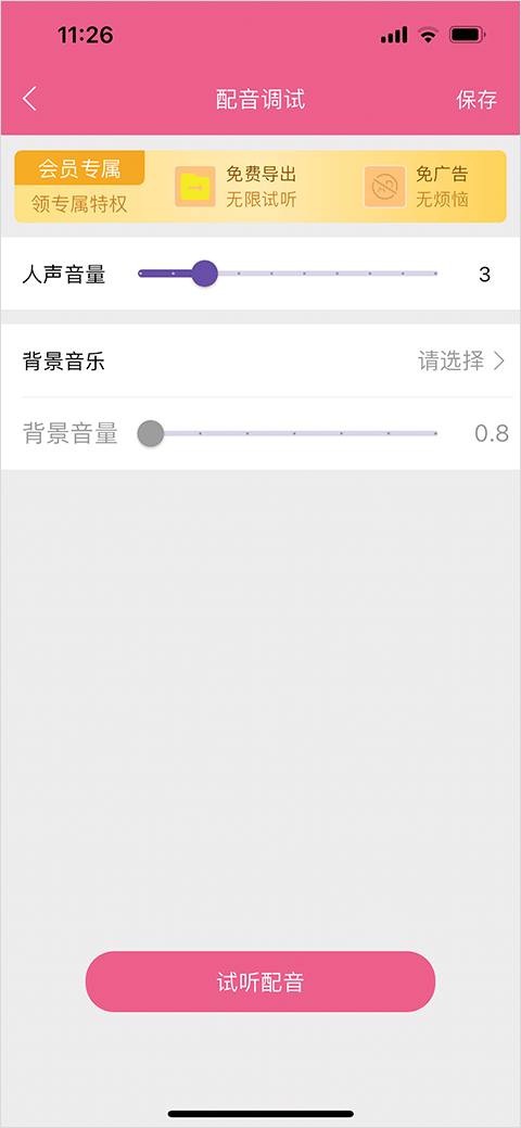 5、在配音调试页面中,调节人声音量与背景音量,达到理想效果。