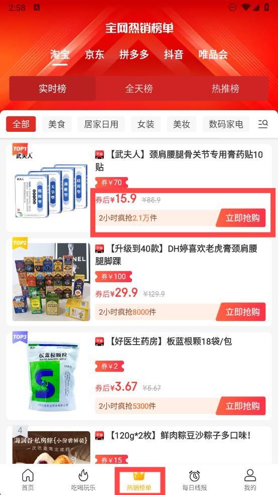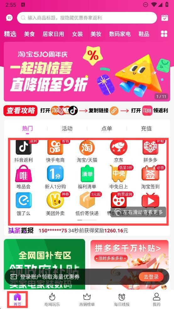 2、点击页面下方中间按钮,进入热销榜单界面,五大热门平台优惠商品可直接抢购。