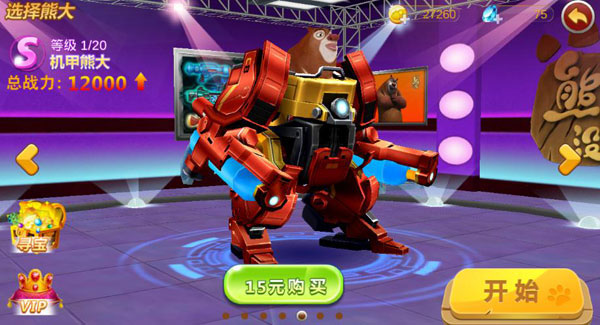战神熊大作为陆地最强机甲,其满级的强力属性当然不用多说了,满级之后33750的超强战力让其他机甲都望而却步。满级之后4000攻击+7500的耐久让玩家在关卡中可以走的更加长远,赛车形态酷炫的外形和机甲形态的威武形象,让玩家通过点击即可轻松转换。