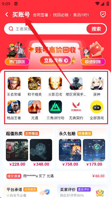 3、点击“买账号”进入专属专区,可浏览王者荣耀、和平精英等热门游戏账号。
