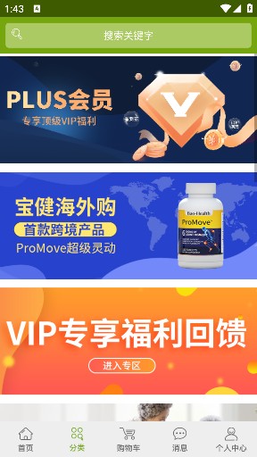 3、首页支持输入关键词搜索保健品,还可浏览保健食品、健康家居、日化护肤等内容。