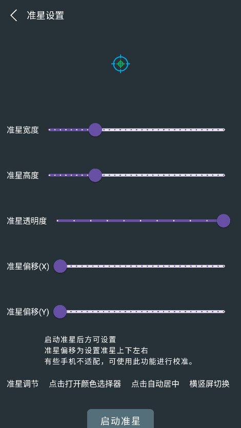 3、支持多参数自定义,可调节准星颜色、大小、透明度、厚度及中心位置。