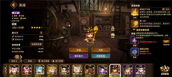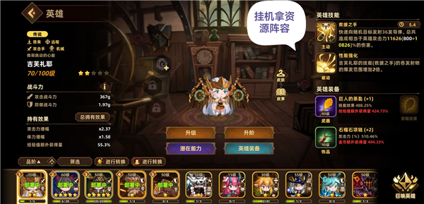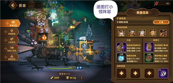 如图推荐,因为英雄资源有限,紫色的小女巫真比机械天使好用。特别注意打boss的工具组,要选免伤一次的这个。