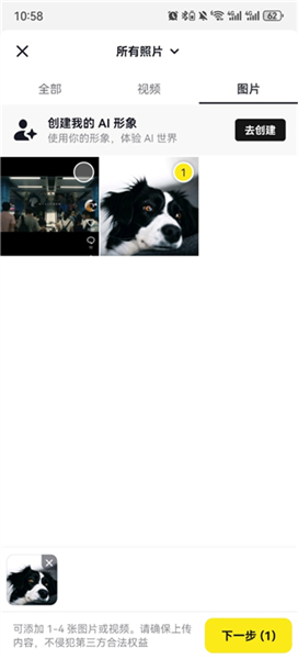 1、点击中间的制作视频,选择ai创作后添加你需要制作的视频或者图片;