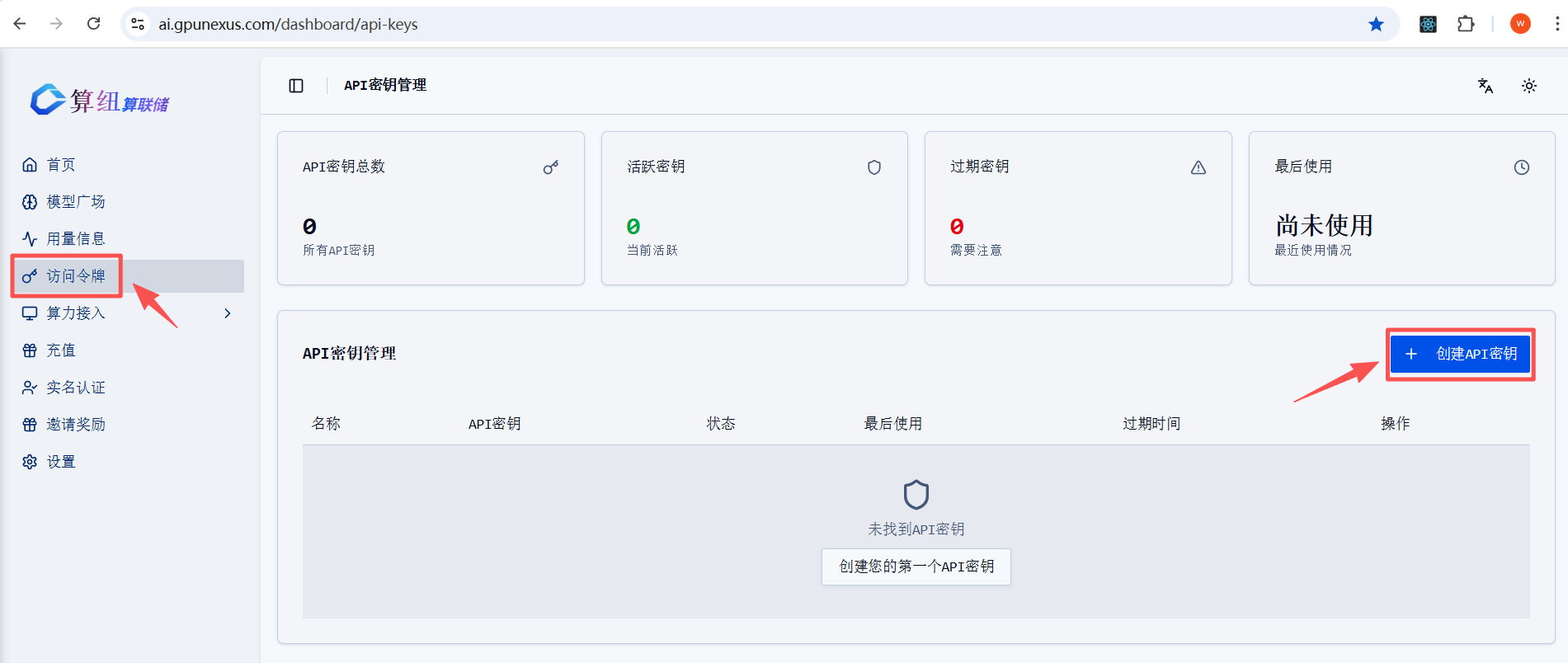 2、点击左侧目录中【访问令牌】进入后,点击右侧【创建API秘钥】