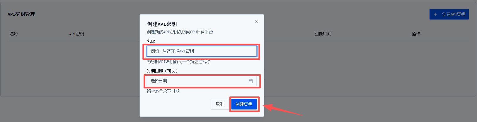 3、输入秘钥名称和设置过期时间后,点击创建秘钥