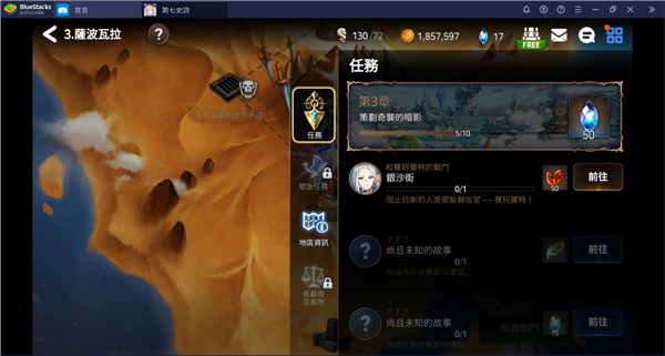 在《第七史诗》里,每一个地区会代表着游戏故事的一个章节,因此探索地区时,将可以了解对应章节的主线故事。在地区地图的介面里,点击右侧栏位的「任务」图示,你便可查看当前章节的任务。每一个章节会包含数个任务,点击任务标签右侧的「前往」图示,便可直接执行该任务。完成每一项任务时,将可以领取对应的奖励。完成章节的所有任务后,还可以领取章节的奖励。