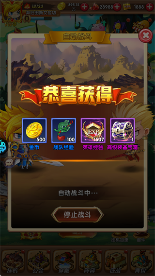 游戏提供自动战斗功能,即使你离线,也能持续积累金币、战队经验、英雄经验和装备宝箱,是长期积累资源的省心方式。