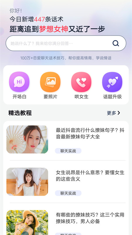 1、各种各样的聊天恋爱话术大全都有,平台这里还支持随时复制撩妹回复话术;