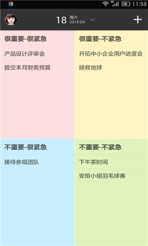 1、高效Todo的主要界面采用了四象限的形式。按照重要紧急程度把事情分成了四类。