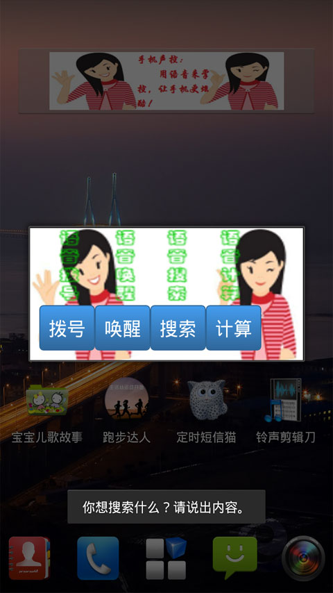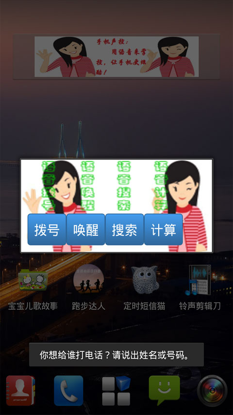 语音发短信、语音读短信、语音拨号打电话、语音唤醒应用、语音自动搜索、语音计算器,语音自动朗读短信为一体的手机语音工具: