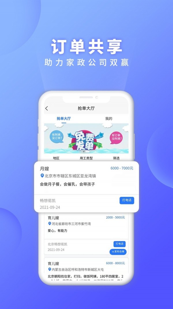 添加抢单大厅功能,实现家政行业的资源共享,不再因单多人少,白白流失客户。
