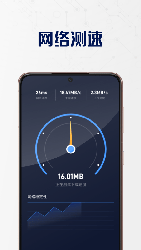 2、一键测速:随时随地测试当前WiFi速度,五档分级,让您对当前WiFi速度一目了然快速。