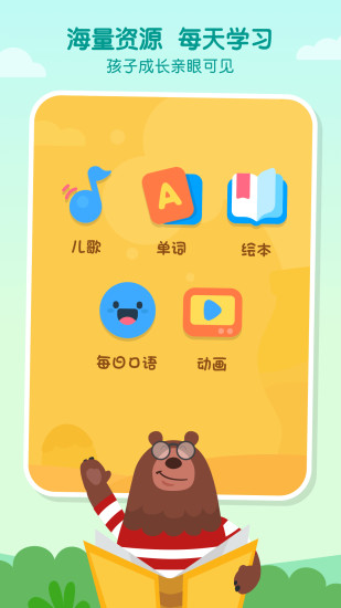 4、资源:各种海量资源免费用!上百本在线启蒙绘本阅读,搭配超萌早教单词闪卡,还有较热幼儿动画片、纯正英文儿歌给孩子们磨耳朵、加上专为宝贝设计的亲子英语小游戏,打造家庭英语学习系统!