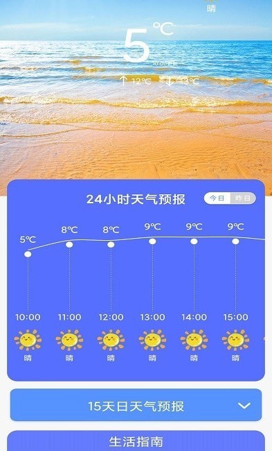 24小时天气及温度预报;未来天气信息及趋势对比;支持2486个国内城市区县和676个国际城市。