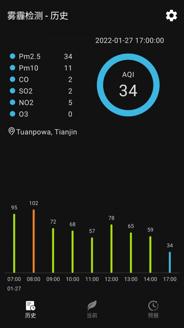 2、并跟随你记录你所在环境的AQI历史,让你能够更加直观的了解到自己每天接触到的空气质量。