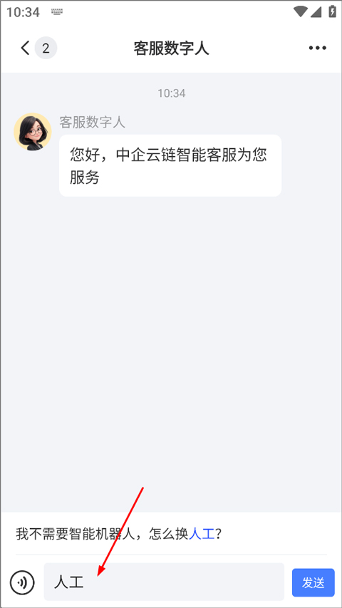 2、进入联系客服页面后,点击下方输入栏,输入“人工”。