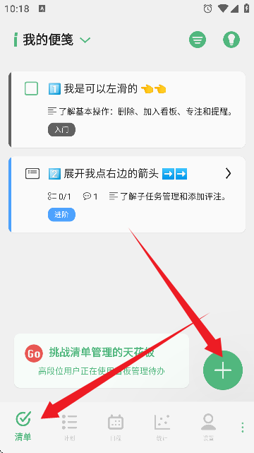 4、在清单界面中可以看到当前现有的清单内容,然后点击右下角的【+】可以添加新的清务。