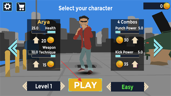1、在【Select-your-character】界面确认角色属性后,点击黄色的【PLAY】按钮,即可进入【Level-1】关卡。
