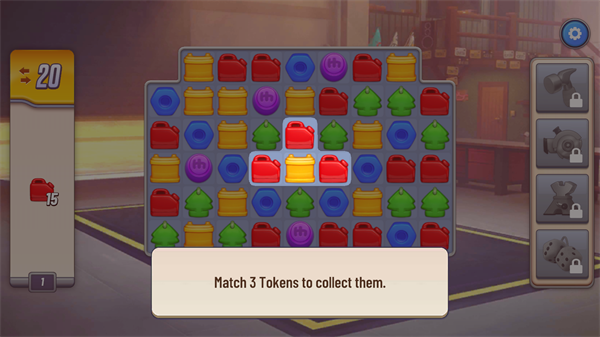 核心玩法为匹配消除方块,成功组合后获得金币与零件。不同颜色代表不同工具或材料,合理规划消除顺序可提升效率并触发特殊奖励。