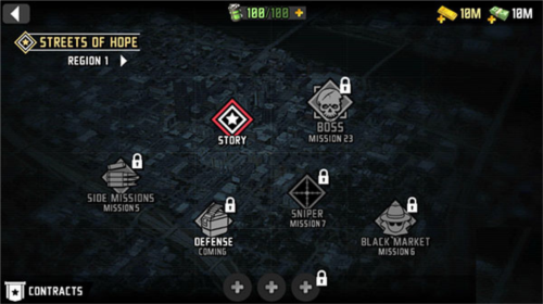 1、下载进入最后的希望3游戏,右侧的红色按钮是任务提示,右上角是金币和钞票显示。