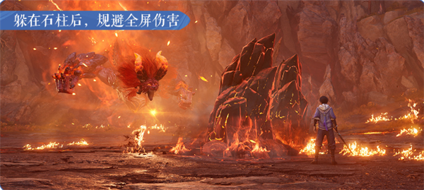 猩红神兽召唤陨石时,要留心脚下红圈,注意躲避。当它施放全屏攻击时,场上的石柱将会成为你的掩体!