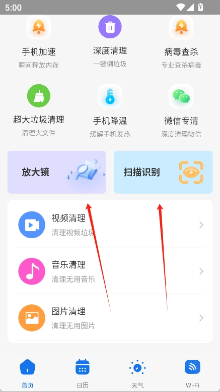 5、在首页下滑,可找到放大镜、扫描识别等工具并直接启用。