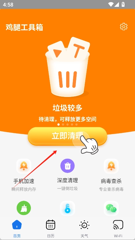 2、在首页点击立即清理按钮,就能快速的清理手机中的垃圾文件。
