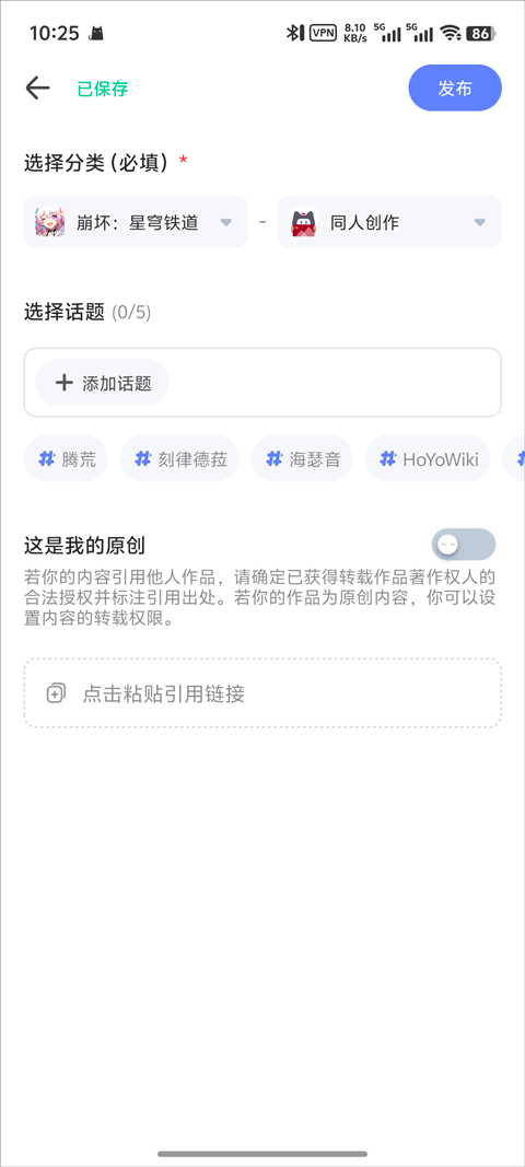 4、输入好后点击下一步,选择分类和话题,再点击右上角发布即可。