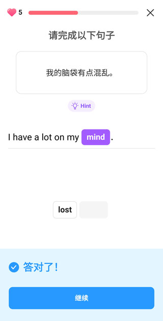 3、系统会播放5个句子语音,需认真聆听并牢记内容,随后点击继续。