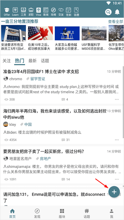 1、首先打开一亩三分地留学论坛官方app,点击右下方添加按钮;