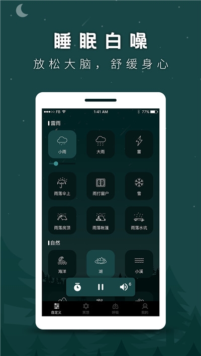 1. 多样化音频选择:睡眠助手提供了超过30种背景音频,包括但不限于海滩浪声、流动溪水、雷雨、风声、蛙声、鸟鸣以及心跳声等,满足用户对不同自然声音的偏好。