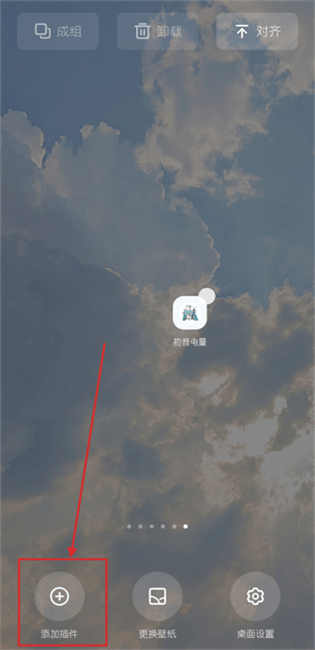 2、安装完成后,可看到初音电量app已显示在桌面,因该程序为小部件,需长按桌面唤起系统自带组件添加功能,点击“添加插件”(不同手机该功能名称可能略有差异)。