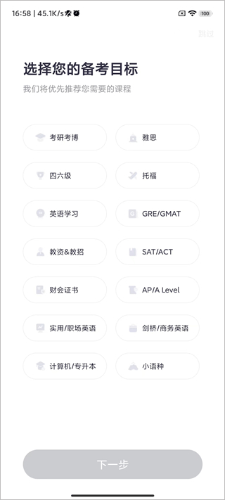 2、选择你的备考目标,系统将根据目标推荐相应课程。